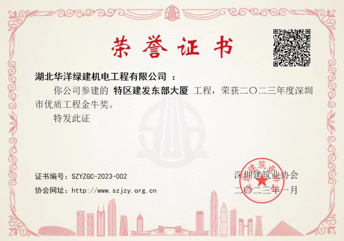 2023/01/18 深圳特區(qū)建發(fā)東部大廈項目榮獲“深圳市優(yōu)質工程金牛獎”